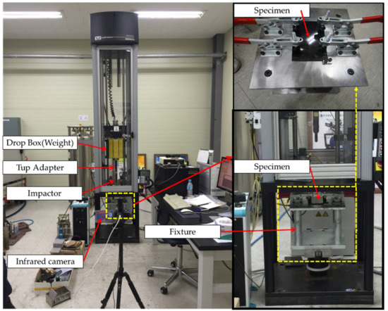 where and are the impact energy (in Joule) and the impact absorption energy (in Joule), respectively. Given that the impactor weight, speed, and drop height are critical parameters in the drop-weight impact test, these parameters were calculated and applied using the formulas specified in the ASTM D 7136 standard. The weight used was 4.23 kg, and the test was conducted with drop height of 0.92 m and drop speed of 4.21 m/s. Figure 2 presents the test equipment and components used. The IR thermal image camera FLIR A655sc (FLIR Systems Inc. Willsonville, OR, USA), with a temperature measurement range of −40 °C to 150 °C and 100 °C to +650 °C and accuracy of ±2 °C or ±2% of reading, was used to convert the radiant energy generated during impact into the temperature domain, and to analyze the relationship between the impact energy and heat energy. In addition, the mode that leads to failure was determined based on the thermal distribution of the impact energy. The temperature results were compared and analyzed by determining the difference between the room temperature before the test and the maximum temperature during breakage (ΔT).