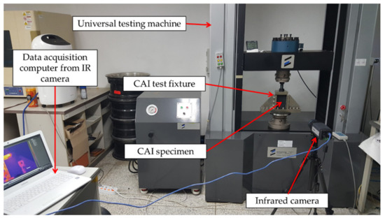 The compression test was conducted on the specimen that underwent into impact test is mainly referred to the compression-after-impact (CAI) test. The CAI was conducted in accordance with the ASTM D 7137 standard. The size of the CAI test specimens was the same as the drop-weight specimens (100 mm × 150 mm). It is common knowledge that the CAI test is conducted for examining the matrix cracking and fiber breakage after impact damage with respect to the lateral shear and vertical stress of laminated composites, in addition to the compressive strength after impact [24,25,26,27]. In particular, delamination is known to reduce the compressive strength of laminated composites by 40–60%. The CAI strength was calculated based on the compressive load and cross-sectional area of the specimen, using the installed jig, as shown in Figure 3. During the test, the IR thermal image camera was installed and used to identify the temperature distribution with respect to breakage. The temperature results were then compared and analyzed based on the difference between the room temperature and the maximum temperature during breakage (ΔT). In addition, the strength degradation after impact was compared with the compressive strength of WSN-3K, which was approximately 440 MPa.