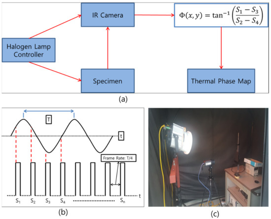 The lock-in method was considered in this study for non-destructive inspection (Figure 4), which is referred to as lock-in IR thermography. This method was employed to obtain the response signal of the object by synchronizing a halogen lamp (heat source) with the IR detection element of the thermal imaging camera, and to realize the detection based on the changes in the infiltrated heat source signal. In this case, the one-dimensional heat conduction Equation (2) in the solid was used as follows [7,14]: