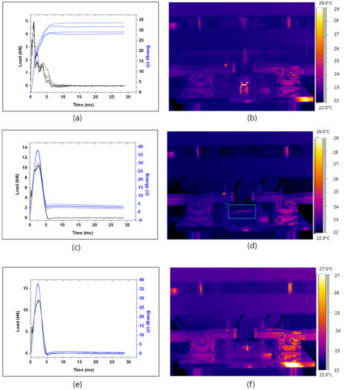 Impact test results for energy and load of specimens with respect to time (left), and thermal distribution image (right): (a,b) specimen laminated at an angle of 0°; (c,d) specimen laminated at an angle of +45°/−45° and (e,f) specimen laminated at an angle of 0°/90°.