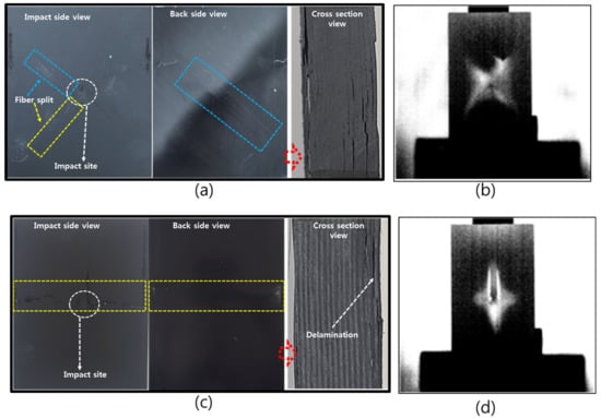 Figure 6 presents the images of the analyzed specimens after the drop-weight impact test using the lock-in method for the specimens +45°/−45° and 0°/90°. In the case of the specimen laminated with all fibers laminated in 0°, the non-destructive inspection method was not conducted because the composite with all plies oriented in 0° was completely broken by the drop-weight impact test. The lock-in non-destructive test was performed to conform the internal damage of the test specimen after the actual drop-impact test. From the images shown in Figure 6a,c, the damage could be observed at the impact side of back side of the composites. The cross-section of the specimens at the center of impact location showed that the delamination and fiber breakage occurred in all composites. It can be seen that the delamination mostly occurred from the back side which can be attributed to impact load transfer as form of tensile stress wave to the back face of the composites. The critical damages were observed at the interlayers and through the fibers splitting.