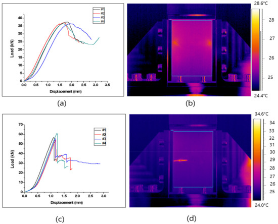 Load-displacement curve of the cai test (left) and thermal image of cai test (right): (a,b) specimen lamination in +45°/−45° and (c,d) specimen lamination in 0°/90°.