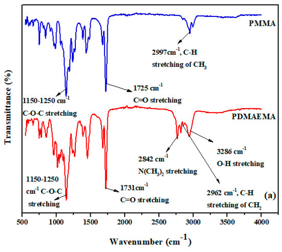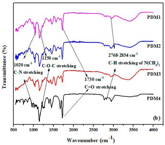 PMMA and PDMAEMA homopolymers are characterized by FTIR, as shown in Figure 4a. Here spectrum for PMMA showed absorption bands at 2997 cm−1 due to the stretching vibrations of –CH2– and –CH3 groups [32]. In PMMA spectrum absorption band at 1730 cm−1 exhibited stretching vibration of C = O group of ester [32]. In PDMAEMA spectrum band at 1730 cm−1 showed C = O group and band at 2842 cm−1 attributed to C-H stretching vibration of N(CH3)2 moieties [33,34]. In both acrylate homopolymers band at 1150–1250 cm−1 showed stretching vibration of C-O-C [35]. Copolymerization of MMA and DMAEMA confirmed and showed in Figure 4b. These copolymers from PDM1 to PDM4 contained the characteristic bands of DMAEMA and MMA. In each spectrum, band at 1020 cm−1 for C–N stretching vibration of tertiary amine confirms presence of DMAEMA segment into copolymers. Bands at 1730 cm−1 for C = O of ester corresponded to MMA moiety in the copolymers [35]. In copolymers PDM1 to PDM4 concentration of DMAEMA decreases and band intensity of C-N group also reduced. On the other hand, concentration of MMA increase from PDM1 to PDM4 hence signal intensity at 1730 cm−1 was enhanced [36]. In both Figure 4a,b bands appeared at 1450 cm−1 due to bending vibration of –CH2 group. DMAEMA is hydrophilic in nature and it absorb moisture and band due to O-H group at 3000–3500 cm−1 in Figure 2a.