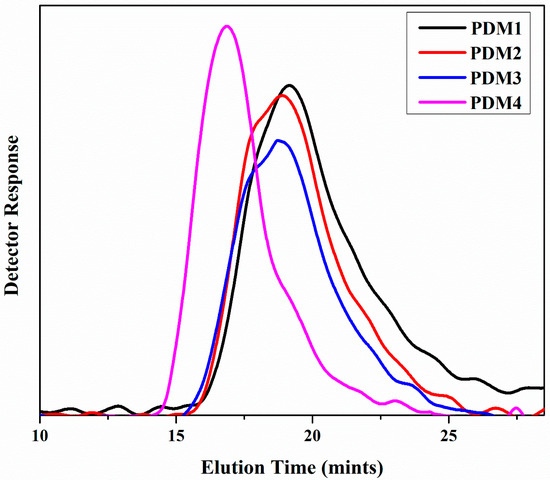 Gel Permeation Chromatography (GPC) analysis of (a) PDM1, (b) PDM2, (c) PDM3 and (d) PDM4.