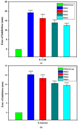 Zone of inhibition of copolymer, PDM1, PDM2, PDM3 and PDM4 with PMMA as a control after t test (**** p < 0.0001): (a) against E. coli; (b) against S. aureus.