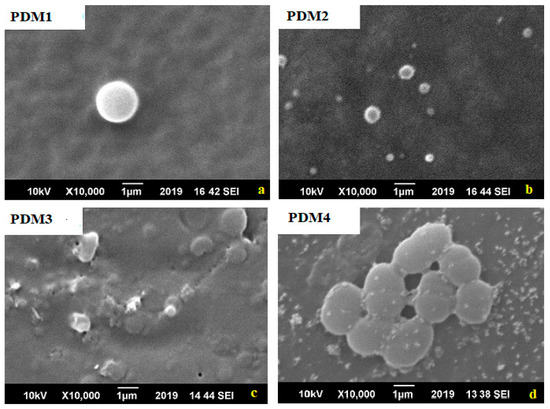 Scanning electron microscopy images for S. aureus that shows biofilm formation trend in copolymers: (a) PDM1; (b) PDM2; (c) PDM3; (d) PDM4.
