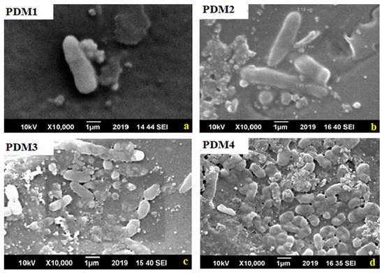 Scanning electron microscopy images for E. coli that shows biofilm formation trend in copolymers: (a) PDM1; (b) PDM2; (c) PDM3; (d) PDM4.