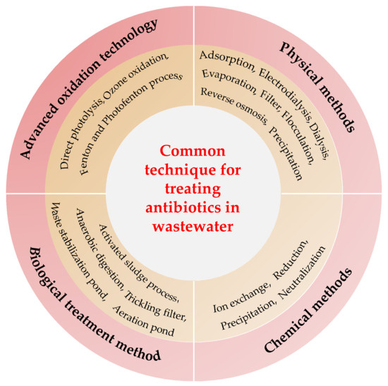 The sewage treatment plant is the last barrier before the wastewater is discharged into the environment. Manvendra et al. [27] pointed out that the sewage treatment plant is designed to degrade the easily and moderately degradable organic matter within the range of mg/L. However, antibiotics mainly exist in in the water at the concentration of ng/L to μg/L and exhibit high activity. Therefore, the sewage treatment plant can partially remove antibiotics but is not suitable for their complete removal. Figure 1 summarizes the following existing techniques for the removal of antibiotic pollutants in water: (1) physical method, which changes the drug from the liquid phase to the solid phase; (2) chemical and biological treatments, which transform the drug into new metabolites and degradation products through chemical reactions [27] and (3) advanced oxidation (mainly ozonation, Fenton and Photo Fenton processes), which includes physical (such as physical adsorption) and chemical reactions. The application of these technologies has achieved good results in the treatment of antibiotic-contaminated wastewater. However, the process must be continuously updated.