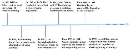 The creation and development of each technology are accompanied by the tortuous process and grinding of time, and electrospinning is no exception. Figure 3 summarizes the primary development history nodes of electrospinning. As early as 1600 A.D. William Gibert [36] found that a droplet interacts with the electrostatic field force in a high-voltage electric field. When a certain amount of electric charge is present on its surface, the droplet deforms into a cone shape and a tiny droplet is ejected from the tip of the cone. He also put forward the concept of “electrospinning”. At the beginning of the 18th century, Stephen Gray mentioned that water droplets undergo electrodynamic atomization in the electrostatic field, and tiny jets are ejected from the tip of the liquid during this process [37]. In 1747, Abbe Nollet performed the earliest known electrospraying experiments and found that water could be sprayed into aerogel in an electrostatic field [38]. Since then, theoretical research on electrospinning has propagated. In 1882, Lord Rayleigh [39] theoretically estimated the maximum charge on the surface of droplet before straight jet injection and provided an essential theoretical basis for further research on the principle of electrospinning. In 1902, John Cooley [40] and William Morton [41] applied for two patents to design prototypes of an electrospinning device. From 1934 to 1944, Anton Formhals successively applied for some patents to improve the electrospinning device, thus allowing the electrospinning technology to move toward commercial production [42]. The preparation technology for electrospinning has matured with the continuous research efforts. However, the understanding of electrospinning mechanics is still in the early stages. In 1964–1969, Geoffrey Taylor published many pioneering works using mathematical language and modeling to describe the change process of solution or melt droplet from spherical to conical under the action of a high-voltage electric field [43,44,45]. Owing to his outstanding contribution, the cone-shaped hemisphere formed by droplets under high-voltage electric field is called “Taylor cone” [46]. In the next 20 years, electrospinning technology did not attract attention from the scientific research and industrial circles. In 1990, some research groups represented by Darrell Reneker and Gregory Rutledge reinvented and promoted electrospinning technology. Their works confirmed that a large number of polymer solutions could be electrospun into fiber membranes [47]. This discovery brought new life to electrospinning and has ushered it in a prosperous period of development. A search with the subject word “Electrospinning” was conducted on the “Web of Science” and produced 42,269 items (11 December 2020). This number will continue to increase in the near future.
