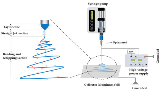 Electrospinning is an advanced fiber preparation technology that uses the interaction between the liquid and electric field to generate products [48]. The apparatus and the process are shown in Figure 4. The electrospinning apparatus is mainly composed of the syringe pump, syringe, spinneret, high-voltage power supply and collector device (commonly used types are aluminum foil and roller). The process and technical principle of electrospinning can be divided into the following three stages [49]. (1) Driven by the syringe pump, the liquid inside the syringe is extruded from the spinneret. The droplet forms a spherical shape at the tip of the spinneret due to the balance of surface tension and gravity. (2) When the electric field force is applied, the surface morphology of the droplet gradually changes from spherical to a conical shape due to the enrichment of electric charges. This process is controlled by gravity, Coulomb force and surface tension. The tip of the cone emits straight jet when the Coulomb force is greater than the surface tension. (3) According to the Rayleigh instability principle and the interaction of the positive charges on the jet surface in the electric field, the duration of the straight jet section is short and thus results in bending and whipping. Owing to Coulomb repulsion force and gravity interaction on its surface, the jet is stretched rapidly in the bending whip section and then solidified into the fiber with the rapid solvent evaporation. The critical voltage of emitting straight jet at hemispherical cone tip can be calculated according to the formula [50]: