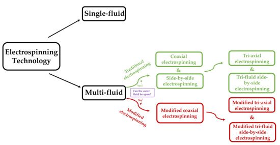 With the in-depth understanding of electrospinning technology, electrospinning technology is continuously being upgraded and optimized. Figure 5 shows that according to the number of working fluids in the spinning process, the electrospinning process can be divided into single- and multifluid electrospinning technology. Multifluid electrospinning technology can further be classified according to the spinnable of the outer fluid into traditional and modified electrospinning technology. Traditional electrospinning technology can also be divided into coaxial and side-by-side electrospinning technology according to the spatial position of the working fluid. Different nanostructures can be prepared by different electrospinning processes, such as core–sheath [83] and Janus [84].