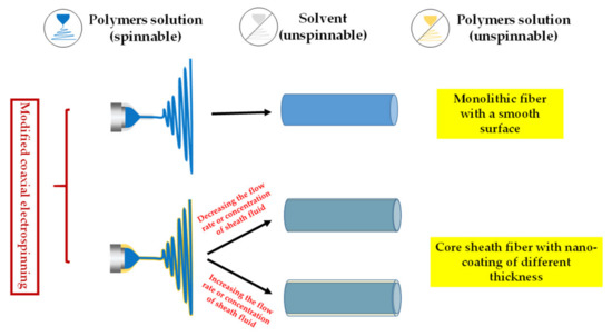 In 2002, Loscertales, I. G. et al. [85] performed coaxial electrospraying experiments (sister technology of electrospinning) and prepared the core–shell nanoparticles for the first time. In the following period, coaxial electrospinning technology has received remarkable attention and development. From the traditional perspective of coaxial electrospinning, researchers believe that the interface between the core and sheath solution produces shear force due to contact friction and viscous dragging. When the shear stress caused by the viscosity of the sheath solution overcomes the interfacial surface tension between the core–sheath solution, the core–sheath fiber can be prepared stably [86]. Therefore, the viscosity of the sheath fluid should be higher than that of the core liquid, and the flow rate of the sheath fluid should be increased to ensure that the sheath liquid could completely cover the core liquid. Hence, the sheath solution must be spinnable prior to coaxial spinning to obtain the fibers with core–sheath structure. However, Yu et al. [87] broke this traditional cognition and used the non-spinnable solvent as the core-wrapping solution for the first time and successfully conducted the modified coaxial electrospinning experiment. After a series of experiments, the core–sheath fibers with a nano-coating layer structure were obtained when the non-spinnable polymer solution was used as the outer solution [88,89]. Figure 6 shows that when using pure solvent as a sheath solution for coaxial electrospinning, the spinning process is stable and a smooth surface monolithic fiber can be obtained. The external solvent can prevent the blockage of the spinneret, resist the negative influence of the external environment [90], and ensure a stable and continuous electrospinning process. In addition, the outer solvent needs to be a good solvent for the polymer being spun. A good solvent as outer fluid can adequately slow down the volatilization rate of the solvent in the working fluid and extend the stretching period of the jet under the action of the electric field to easily obtain high-quality fibers with small diameter and smooth surface. When the non-spinnable polymer solution is used as the sheath solution, the nanocoating with different thickness can be achieved by controlling the flow rate and concentration of the sheath. This discovery dramatically broadens the available polymer materials for electrospinning. At present, about 100 kinds of spinnable polymer materials have been discovered. However, many types of liquids are still not spinnable. With this technology, various liquids (solution, emulsion and suspension) can be used in electrospinning, thus fully utilizing the advantages of fiber membrane in various fields [91].