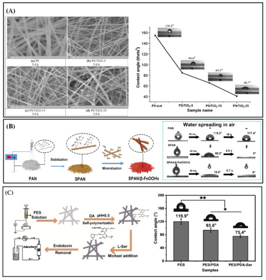 (A) SEM images and water contact angles of PS, PS/TiO2-5, PS/TiO2-15 and PS/TiO2-25 fiber membranes [115]; (B) preparation process and water contact angles of SPAN/β-FeOOHx nanofibers [118] and (C) preparation process and water contact angles of PES/L-Ser functional membranes [119].