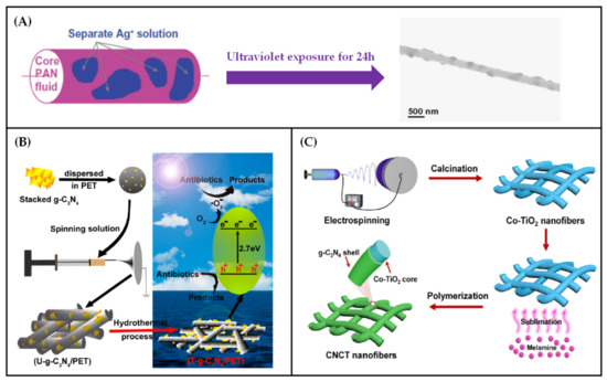 (A) The process of converting Ag+ into Ag nanoparticles on the surface of PAN fiber by UV radiation [123]; (B) the preparation process of T-g-C3N4/PET nanofibers and the mechanism of degradation of antibiotics under solar irradiation [124] and (C) flow chart of preparation of soft CNCT nanofiber films [125].