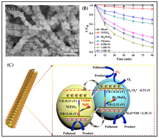 Compared with TiO2, titanium-based perovskite oxide (NiTiO3) had a suitable bandgap (2.18 eV) and unique sunlight lighting ability. However, its photocatalytic performance was greatly limited because of its low carrier separation ability. NiTiO3 nanofiber membrane was prepared by electrospinning and calcination and then uniformly loaded with Bi2MoO6 by the solvothermal method [191] (Figure 12A). As shown in Figure 12B, the TC degradation efficiency of NiTiO3/Bi2MoO6 nanofiber membrane (1.0 Bi-Ni) was 11.6 times higher than that of pure NiTiO3 nanofiber membrane. The antibiotic degradation activity of the physical mixture of NiTiO3 and Bi2MoO6 was significantly lower than that of NiTiO3/Bi2MoO6 heterojunction nanofiber membrane, indicating the good interfacial contact between NiTiO3 and Bi2MoO6 achieved by loading on the fiber surface. The main active substances for photocatalytic degradation of TC by NiTiO3/Bi2MoO6 were holes and superoxide radicals, which was similar to the TiO2/BiOCl. The close contact and matched band arrangement on the fibers could effectively promote the transfer and separation of carriers, and significantly improve the photocatalytic degradation of TC (Figure 12C).