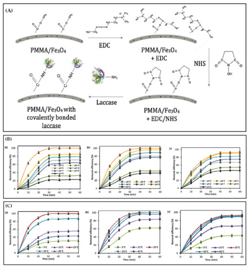 - Qiu, X.; Wang, Y.; Xue, Y.; Li, W.; Hu, Y. Laccase immobilized on magnetic nanoparticles modified by amino-functionalized ionic liquid via dialdehyde starch for phenolic compounds biodegradation. Chem. Eng. J. 2020, 391, 123564. [Google Scholar] [CrossRef]