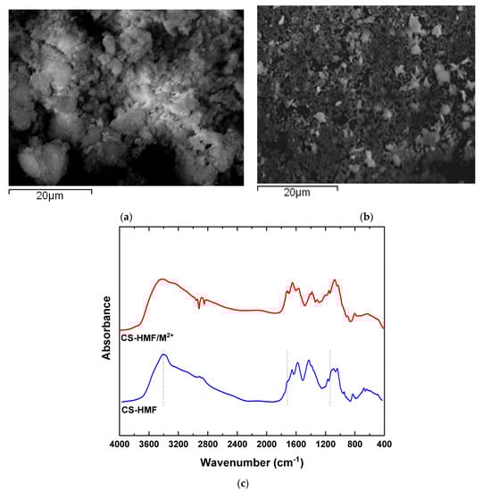 The morphology of the CS-HMF derivative was evaluated with scanning electron microscopy. Figure 1a depicts the morphology of CS-HMF before the process of adsorption, while the morphology after metal ions adsorption is presented in Figure 1b. Moreover, in Figure 1c the obtained FTIR spectra before and after the metal ions adsorption is presented. According to Figure 1a, the CS-HMF adsorbent does not have a smooth surface morphology, resulting in irregular shape with a rough surface possibly due to the processes of cross-linking and grafting. In addition, Figure 1b depicts that the uptake of metal ions (Ni2+, Hg2+, Ba2+) caused by the smashing of the derivative, probably due to the extreme conditions of pH.