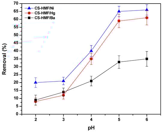 During the process of removal of model pollutants, the pH effect plays a significant role because it controls the generated interactions (adsorbate–adsorbent) []. The pH-behavior on the process of adsorption is shown in Figure 2. It can be observed that the trend of the obtained pH curves is the same in the case of Ni2+ and Hg2+ adsorption (meaning that when increasing the pH, the ion removal increases), while in the case of Ba2+, it differentiates. The latter increase is milder for Ba2+ compared to other ions (Ni2+ and Hg2+). The differentiation of the barium ions removal may be attributed to the affinity (ionic radius of barium ion is larger than that of nickel and mercury ion). However, the highest removal percentage that found, for all cases of heavy metal ions (Ni2+, Hg2+, Ba2+), was at pH = 6. The low uptake level of metal ions at high acidic conditions is attributed to the excess of hydrogen concentration (H+) ions, which compete with metal ions for binding sites on CS-HMF []. Additionally, the protonation of amino groups to varying degrees at strong acidic conditions results in the decrease in available surface sites, for the uptake of metal ions []. It must be noted that other research observes that the highest percentage for Ni2+, Hg2+, and Ba2+ uptake is in pH range 4–6 [,,,].
