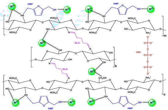 Proposed interactions for the removal of metal ions M2+ (Ni2+, Hg2+, Ba2+) by adsorption onto CS-HMF.