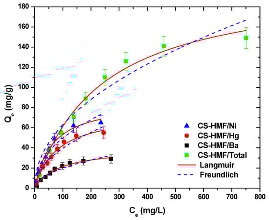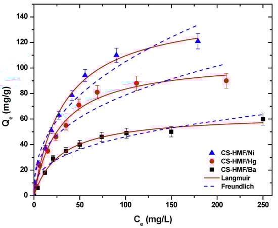 Figure 5 presents the equilibrium isotherm curves, at T = 25 °C, after the fitting of Langmuir and Freundlich models for the uptake of Ni2+, Hg2+, and Ba2+ metal ions form aqueous solutions (single-component) by using CS-HMF adsorbent.