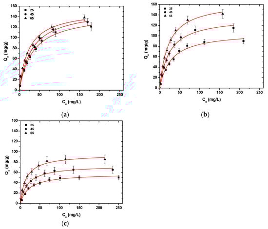 Isotherms for the uptake of (a) Ni2+; (b) Hg2+; (c) Ba2+ from aqueous solutions (single component). Testing conditions: T = 25–65 °C, C0 = 10.0–300.0 (mg/L), N = 160 rpm, V = 20.0 mL, t = 200 min, m = 0.02 g, pH = 6.