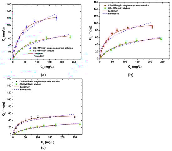 Equilibrium data for the uptake of (a) Ni2+; (b) Hg2+; (c) Ba2+ from single- and multi-component aqueous solutions, fitting to the equations of Langmuir and Freundlich. Testing conditions: T = 25 °C, C0 = 10.0–300.0 (mg/L), N = 160 rpm, V = 20.0 mL, t = 200 min, m = 0.02 g, pH = 6.