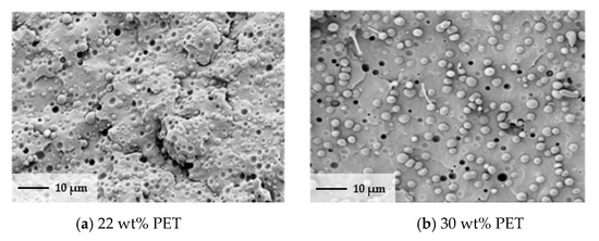 Figure 4a–c shows that the 22, 30, and 40 wt% PET is homogeneously dispersed in the PP matrix in the form of spherical particles or droplets with a diameter of 2–6 µm. Craters in the matrix of the same shape and size of particles were also observed. It can be inferred that the craters were created because of PET droplet pullout during cryogenic fracture. A PET content of 45 wt% led to large PET and PP spherical areas and smaller droplets inside this phase.
