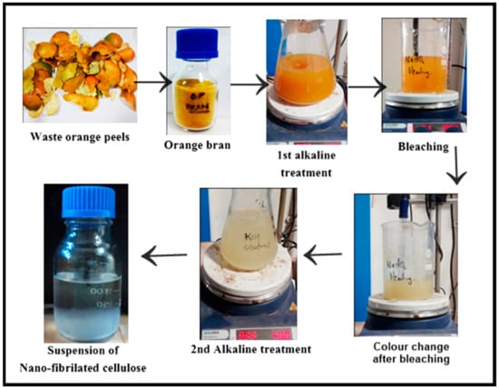 The fruit of the citrus species Citrus × sinensis is sweet orange. Orange peel is a waste by-product from fruit juice factories across the world. All the plant matter constitutes about 30% cellulose; cotton and wood being the highest, i.e., 90% and 50%, respectively [1]. The polysaccharide available in abundance having the repetitive unit (C6H10O5)n and comprising of D-glucose is cellulose. This cellulose, being a fibrillary constituent of a plant cell, can be extracted from numerous natural sources such as wood and a few lignocellulosic fibres. There are chains that exist in cellulose which are stacked in an ordered format to make up a compact microfibril, which can be stabilized by hydrogen bonding whether it is inter-nuclear or intra-nuclear. Materials with cellulosic content have been investigated by researchers for decades due to their easy surface modifications and wide applications [2,3]. The existence of cellulose that is found as a common material in plant cell walls was first acknowledged by Anselm Payen in 1838, and this cellulose occurs in almost its purest form in the fibres of cotton. Yet, in wood, stalks and plant leaves, it is found in combination with lignin and hemicelluloses [4,5]. As a function of plant species along with its growth function, crystalline and amorphous domains are obtained in native cellulose fibres in variable ratios. Thus, it makes the properties of cellulose nanocrystal widely dependent on the sources of cellulose. The extraction, finding a suitable application, and its characterisation have given rise to varied terms, crystallites, whiskers, nanocrystals, nanofibers and nanofibrils, that have generated much activity globally: (i) NCC (NanoCrystalline Cellulose) and (ii) NFC (Nano-fibrillated Cellulose). Some of the novel methods for cellulose production include top-down methods that involve physical/enzymatic/chemical techniques for its isolation from agricultural/forest residue and wood, while bottom-up methods involve glucose bacteria to develop nano-fibrillated cellulose [6,7]. These cellulosic materials with one of their dimensions in the nanometre range are termed generically as nanocelluloses. Nano-fibrillated Cellulose (NFC) pertains to fibres that have been fibrillated to accomplish agglomerates of cellulose microfibril units; they are less than 100 nm in diameter with a length of several micrometres. Several terminologies exist for relating this material, but most often Nano/MicroFibrillated Cellulose (NFC/MFC) is used [8]. Numerous approaches can deliver cellulose nanofiber extraction, leading to diverse kinds of nanofibrillar materials, which depends on the raw material, pre-treatment, and disintegration of cellulose chains [9,10,11,12,13]. Since the citrus sinensis consists of a considerable amount of cellulose (14%), this material is potentially appropriate as a reinforcing component in high-performance composites. NFC can be produced by chemical or mechanical treatments such as acid hydrolysis. During the acid hydrolysis, chemistry for the hydrolytic cleavage of the glycosidic bonds takes place chiefly in the amorphous sections of the cellulose, which releases individual crystallites [14].