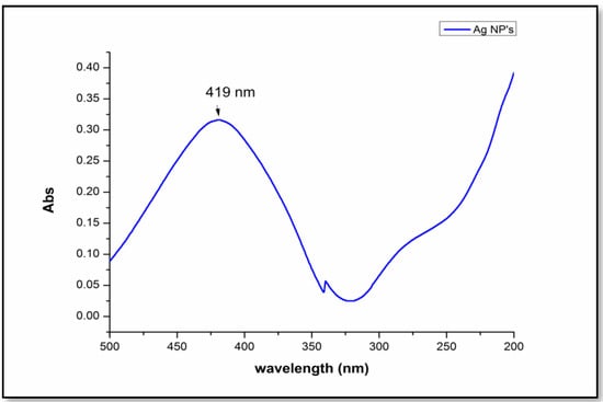 The reaction mixtures containing AgNO3 with orange peel extract turned yellow to brown after 12 h of incubation in the dark. Control silver nitrate solutions without the extract of orange peels did not develop a brown colour. This shows that the waste orange peels successfully acted as a reducing and capping agent. Plasmon resonance was displayed by silver nanoparticles. Figure 3 shows the absorption spectrum of silver nanoparticles at 419 nm, which confirmed its presence [30].