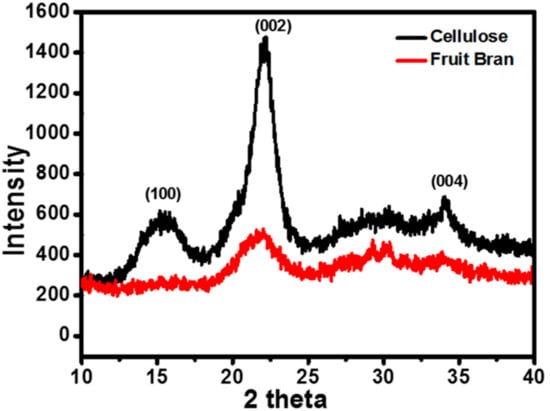Orange bran and nano-fibrillated cellulose were analysed by XRD for their crystallinity index. Figure 4 shows X-ray diffractogram of isolated NFC and fruit bran. Nano-fibrillated cellulose showed a characteristic peak at 2ϴ = 29° and 2ϴ = 30°. Mostly, the diffraction angle lies between 25–35° for nanocellulose, which can be indexed as (100), (002), and (004) inferring to the monoclinic phase. This result is in accordance with the findings of Morais J and group [25]. Using X-ray diffraction data and Scherrers equation t = kλ/βCosϴ, the average crystallite size was estimated where t is crystallite size of the sample, β is full width half maxima (FWHM), and k is the wavelength of X-ray used, i.e., 1.548. The average grain size calculated was 6 nm. With the help of the intensity of amorphous peaks, the crystallinity index of orange peel bran and NFC was calculated. The crystallinity index is related to the strength and stiffness of fibres [31]. The crystallinity index of orange bran was 39% and that of NFC was 75%. Hence, the crystallinity index was increased by 36% after the chemical and mechanical treatments. It seems to be that the acid hydrolysis had much less effect on the morphology of these particles.