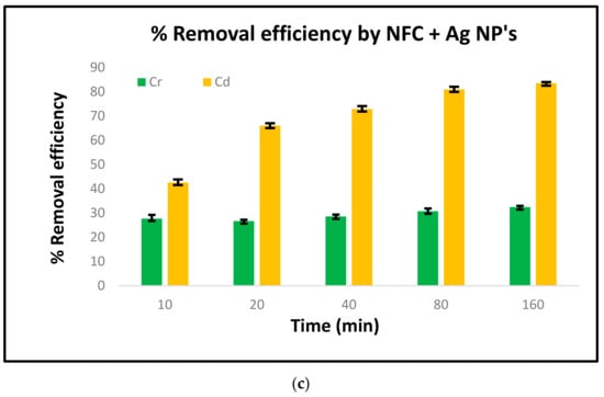The removal efficiency at each interval was calculated by the formula (CiCf)/Ci × 100, where Ci and Cf are the initial and final metal concentrations, respectively. Figure 8a–c shows the comparative chart for the removal efficacy of Cr (II) and Cd (II). The highest removal efficiency was found for cadmium, i.e., 83.49%, by using silver and NFC together as a bio sorbent. The cellulose acted as an absorber, where it makes an interface with the silver nanoparticles and enhances the efficacy. The second highest was for cadmium, i.e., 47.21%, but by using only nano-fibrillated cellulose as a bio sorbent. The maximum sorption for both cadmium and chromium was observed with silver along with NFC, i.e., 83.49% and 32.20%, respectively. In one set with cadmium containing silver as a bio-sorbent, after 40 min the metal-ion estimation which reduced showed an increase of 10 mg/lit at 80 min. This was because the adsorbate and adsorbent attained equilibrium and were incapable of further sorption. Thus, at one point after equilibrium, concentration was lowered in the metal-ion concentration solution and, again, the substance undergoing the sorption changed to its bulk state [34,35].