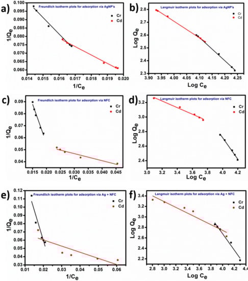 To demonstrate the adsorption by AgNPs, NFC, and Ag + NFC, Freundlich isotherm was utilized for cadmium and chromium heavy metals, for which the equation is given as: