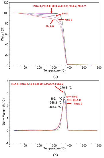 (a) Thermogravimetric analysis (TGA) and (b) derivative thermal gravimetric (DTG) curves of poly(L-lactide) (PLLA), poly(D-lactide) (PDLA), and the PLLA/PDLA (LD) blend at a heating rate of 10 °C/min.