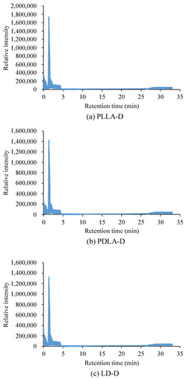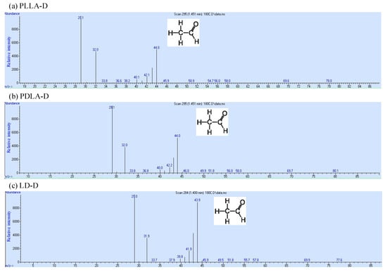 The thermal stability of PLLA, PDLA, and LD under the two sets of storage conditions is shown in Figure 1. PLLA-R, PDLA-R, LD-R, PLLA-V, PDLA-V, and LD-V had onset temperatures (T0) of thermal degradation of 300 °C and a maximum degradation rate (Tmax) of 370~371 °C. The T0 values of PLLA-D, PDLA-D, and LD-D were 89, 64, and 130 °C, respectively, and their Tmax values were 368, 367, and 369 °C, respectively. The thermal stability of PLLA-R, PDLA-R, LD-R, PLLA-V, PDLA-V, and LD-V were almost identical, whereas those of PLLA-D, PDLA-D, and LD-D were markedly lower; LD-D had the highest thermal stability, followed by PLLA-D and then PDLA-D. The samples stored in the vacuum-free desiccator exhibited significant levels of hydrolytic degradation, leading to a significant reduction in the T0 and Tmax values of PLLA-D, PDLA-D, and LD-D; this finding indicates that storage conditions can significantly affect the thermal stability of PLA. According to the T0 of the sample, the degradation products of PLLA-D, PDLA-D and LD-D were analyzed using gas chromatography–mass spectrometry at 180 °C. Each degradation product was detected and identified by the mass spectra of each main chromatographic peak (see Figure 2). There was a peak at 1.4 min, and the mass-to-charge ratio (m/z) was 44. The characteristic fragmentation patterns observed in the Py–GC/MS spectra are shown in Figure 3. McNeill and Leiper studied the degradation of PLLA under controlled heating and isothermal conditions and reported that the main products were cyclic oligomers, including lactide and other low-boiling products such as carbon dioxide, acetaldehyde, ketene, and carbon monoxide [23,24]. After the library search and literature mass spectra analysis, PLLA-D, PDLA-D and LD-D degradation products were identified, and the main degradation product was found to be acetaldehyde [25,26]. The results showed that all samples had the same main degradation products at 180 °C.