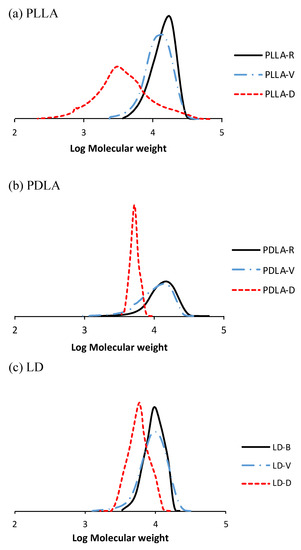 Figure 4 demonstrates the GPC curves of the PLLA, PDLA, and LD samples under the two sets of storage conditions. The molecular weight distributions of all the samples shifted to lower molecular weights during storage. The Mn, Mw, and I.V. of PLLA, PDLA, and LD obtained through GPC are plotted in Figure 5. The results of Mn, Mw, and I.V. revealed that the samples stored in vacuum-sealed bags hydrolyzed slowly, whereas those stored in the vacuum-free desiccator degraded significantly. This indicates that the hydrolysis levels of PLLA, PDLA, and LD samples under two different storage conditions, both of which are common in most polymer laboratories, are quite different. Although the molecular weight of LD-R is lower than that of PLLA-R and PDLA-R before hydrolytic degradation, the molecular weights of LD-D were significantly higher than that of PLLA-D and PDLA-D after hydrolytic degradation. In addition, the thermal stability of LD-D was higher than that of PLLA-D and PDLA-D (Figure 1). These results indicate that stereocomplexation strongly prevented hydrolytic degradation, which have been reported in the literature [18,19,20,21,22].