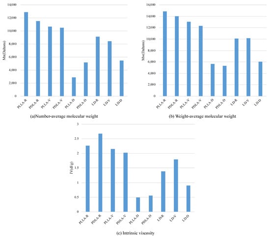 (a) Mn; (b) Mw; and (c) intrinsic viscosity (I.V.) of PLLA, PDLA, and LD.