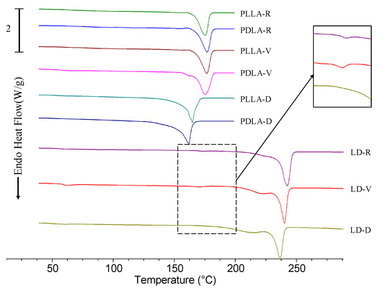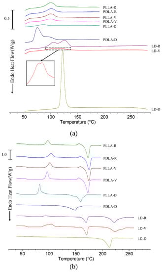 The melting behaviors of PLLA, PDLA, and LD are illustrated in Figure 6. The first heating curves of PLLA-V and PDLA-V revealed melting behaviors almost identical to those of PLLA-R and PDLA-R. These heating curves had a melting peak at 175–177 °C; these peaks were caused by the melting of homocrystals [27]. The corresponding cooling and reheating curves of PLLA and PDLA at 10 °C/min after melting at 200 °C for 3 min are shown in Figure 7. PLLA-V and PDLA-V exhibited homocrystallization behaviors almost identical to those of PLLA-R and PDLA-R during cooling (Figure 7a). They demonstrated cold crystallization peaks followed by melting peaks at 173–175 °C during reheating owing to the melting of homocrystals. The melting enthalpy values in the reheating curves of PLLA-V and PDLA-V were 51.3 and 52.5 J/g, respectively (Figure 7b). These values were slightly higher than the corresponding values for PLLA-R and PDLA-R, which were 50.7 and 50.4 J/g, respectively. However, the melting behaviors of PLLA-D and PDLA-D differed significantly from those of PLLA-R and PDLA-R; the melting peaks of the first heating curves of PLLA-D and PDLA-D occurred at 164.7 and 161.8 °C, respectively (Figure 6). The cooling curve of PDLA-D indicated high crystallization enthalpy (Figure 7a). During reheating, the melting peaks of PLLA-D and PDLA-D occurred at 159.8 and 149.3 °C, respectively (Figure 7b). No cold crystallization peak of PDLA-D was observed during reheating. The melting enthalpy values in the reheating curves of PLLA-D and PDLA-D were 52.1 and 54.0 J/g, respectively. Evidently, the melting peaks of PLLA-D and PDLA-D were significantly lower than those of PLLA-R and PDLA-R. However, the melting enthalpy values of PLLA-D and PDLA-D were higher than the corresponding values of PLLA-R and PDLA-R.
