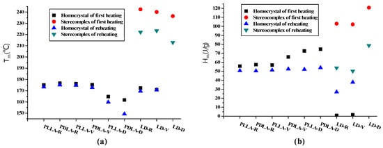 (a) Melting peaks and (b) melting enthalpy values of the first heating and reheating curves for PLLA, PDLA, and LD at a heating rate of 10 °C/min.