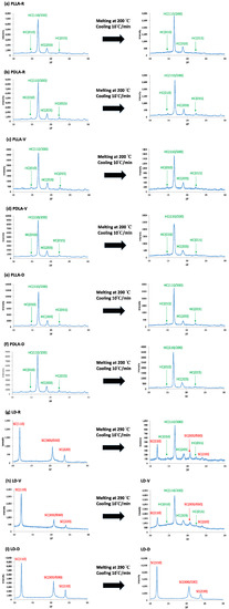 Wide-angle X-ray diffraction (WAXD) profiles of (a) PLLA-R, (b) PDLA-R, (c) PLLA-V, (d) PDLA-V, (e) PLLA-D, (f) PDLA-D, (g) LD-R, (h) LD-V, and (i) LD-D before and after melting and then cooling to room temperature at a rate of 10 °C/min. Here, (010), (110/200), (203), and (015) are related to homocrystal reflections; whereas (110), (300/030), and (220) are related to stereocomplex crystal reflections.