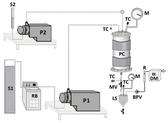The bench plant used for the SAS tests is drafted in Figure 1. Briefly, the high-pressure pump P1 allows delivering the CO2 (stored in reservoir S1) to the precipitation chamber (PC, internal volume of 500 cm3). The high-pressure pump P2 permits to feed the liquid solution (stored in the burette S2), which consists of the solutes (RUT, β-CD) solubilized in the liquid solvent (DMSO); in detail, it is injected through a 100 µm internal diameter stainless-steel nozzle. The temperature control (TC) in the PC is ensured by a controller connected with an electrically thin band. The pressure is determined by a test gauge manometer (M), whereas its regulation is assured through a micrometric valve (MV). The precipitated powder is collected at the bottom of the PC on a stainless-steel filter (size of pores of around 0.1 μm), which also allows the passage of the mixture CO2–DMSO. Downstream the PC, the DMSO is recovered in the separator LS, whose pressure is fixed at a lower value than that into the PC (about 2.0–2.5 MPa) through the backpressure valve BPV. The flow rate and the total quantity of delivered CO2 are measured at the exit by a rotameter (R) and a dry test meter (DM), respectively.