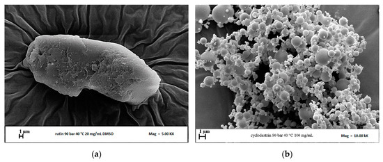 FESEM images of powders precipitated from DMSO at 9 MPa and 40 °C: (a) RUT (run #1); (b) β-CD (run #2).