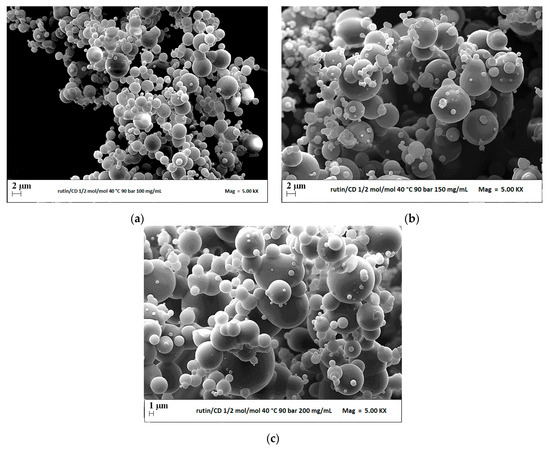 The first set of experiments (runs #3–5) was performed to investigate the effect of the overall concentration of solutes in DMSO, at a fixed pressure of 9 MPa and RUT:β-CD ratio equal to 1:2 mol:mol. Increasing the concentration from 100 to 200 mg/mL, well-separated and spherical microparticles were obtained in all cases, as it is possible to observe in Figure 3.