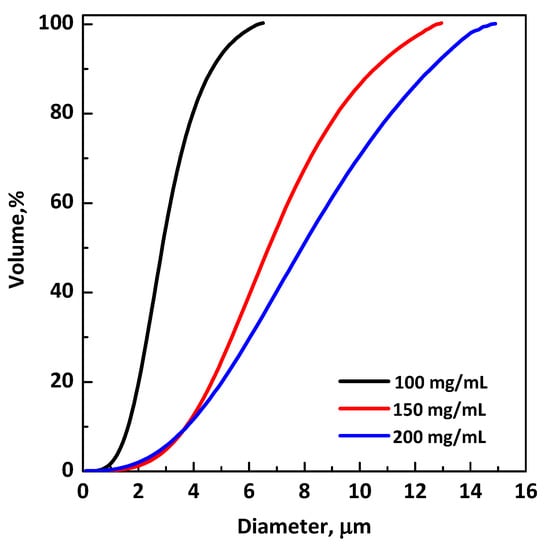 The influence of the total concentration of solutes in the liquid solution is shown in Figure 4, where a comparison of the volumetric cumulative PSDs of particles precipitated at 40 °C and 9 MPa is reported. It can be noted that the dimensions of microparticles increased by increasing the concentration in DMSO.