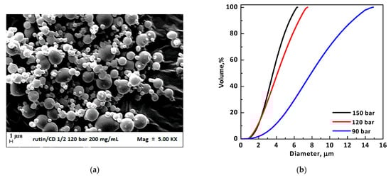 (a) FESEM image of RUT–β-CD 1:2 mol:mol microparticles precipitated from DMSO at 40 °C, 200 mg/mL, and 12 MPa (run #6); (b) volumetric PSDs of RUT–β-CD microparticles 1:2 mol:mol: effect of the operating pressure.
