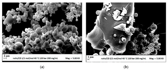 For this reason, the following test (run #9) was performed at 200 mg/mL and RUT:β-CD ratio 1:1 mol:mol, but increasing the pressure at 12 MPa to shift the operating point above the MCP of the quaternary system. Microparticles at molar ratio guest:host 1:1 (Figure 6a) were produced at 12 MPa. Given the positive result, a further increase of the RUT:β-CD ratio at 2:1 mol/mol working at 12 MPa and 200 mg/mL (run #10) was attempted. In Figure 6b, it can be observed that, in this case (run #10), large crystals and microparticles precipitated from DMSO, meaning that the coprecipitation was not effective and that the operating point was near/below the MCP. This result confirms that the presence of RUT strongly modifies the VLEs of the DMSO–CO2 binary system and that it is important to identify, for each ternary or quaternary system, the proper operating conditions to conduct the experiments.
