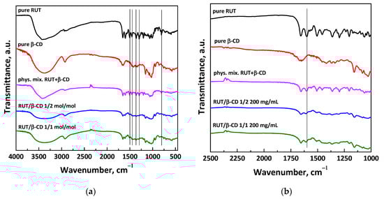 FT-IR spectra of unprocessed RUT and β-CD, physical mixture NSAID+ β-CD and SAS-processed RUT–β-CD powders at different molar ratios: (a) entire spectra; (b) enlargement of the spectra.