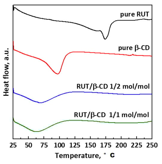 DSC thermograms of unprocessed RUT and β-CD and SAS-processed RUT–β-CD at different molar ratios (1:2 and 1:2 mol:mol) are reported in Figure 8. The thermogram of pure RUT exhibits an endothermic peak in the range 143–190 °C, which is related to the phase transition and the molecular rearrangement of RUT; i.e., the melting point [15]. It is possible to note that this characteristic peak of rutin disappears in the thermograms of SAS-processed RUT–β-CD powders because RUT is encapsulated in the β-CD cavity thanks to the formation of weak interactions between the host and the guest [31,32,33]. Moreover, the thermogram of the pure β-CD shows a broad endothermic peak in the range 75–115 °C because of the dehydration [13]. The intensity of this peak reduces in the case of all SAS RUT–β-CD powders, due to the loss of water molecules in the β-CD cavity replaced by the hydrophobic RUT. Indeed, this replacement allows reaching a lower and more stable energy state with the formation of inclusion complexes [48].