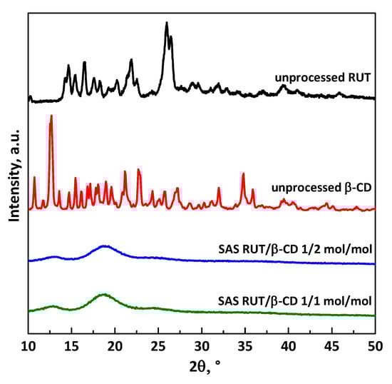 XRD analyses were also performed on unprocessed RUT and β-CD, and SAS processed RUT–β-CD at different molar ratios (i.e., 172 mol:mol and 1:1 mol:mol), as reported in Figure 9. The XRD patterns of pure RUT and β-CD show the crystalline state of both the materials, whereas all SAS RUT–β-CD powders show an amorphous structure. This change in the solid-state of materials is attributed in the literature to the formation of amorphous inclusions [31]: The characteristic peaks of the active compound disappears in the XRD patterns of SAS powders because RUT molecules are incorporated and “hidden” in the cavity of the amorphous β-CD.