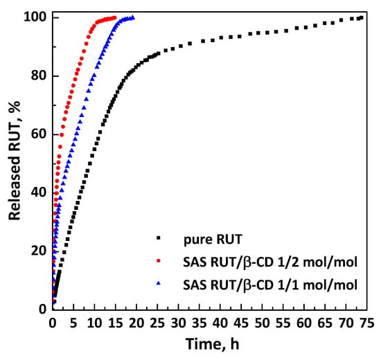 Dissolution tests (Figure 10) were performed to compare the dissolution rate of unprocessed active compound and RUT from SAS complexes at different molar ratios of RUT:β-CD (1:2 mol:mol and 1:1 mol:mol). It was observed that 90% of pure RUT dissolved in PBS in about 30.4 h, whereas it took about 7.7 and 12.7 h in the case of SAS complexes RUT–β-CD 1:2 and 1:1 mol:mol, respectively. Therefore, the dissolution rate of RUT is increased up to about 3.9 and 2.4 times with RUT–β-CD 1:2 and 1:1 mol:mol inclusion complexes, respectively.