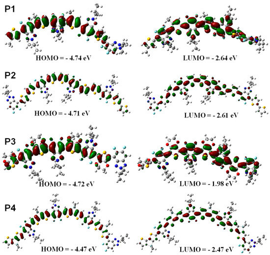 Optimized geometries and molecular orbital surfaces for the HOMO and LUMO values of P1–P4 obtained using a DFT/B3LYP/6-31G* method.